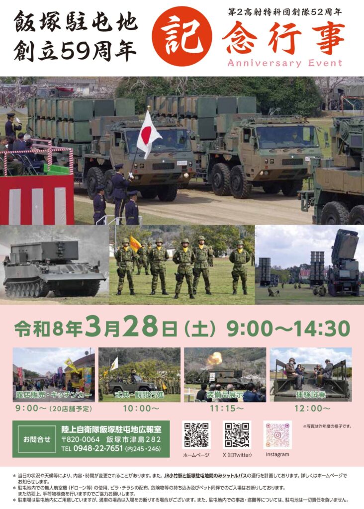 2026年3月28日(土)、陸上自衛隊 飯塚駐屯地で「飯塚駐屯地 創立59周年・第2高射特科団 創隊52周年記念行事」が開催!