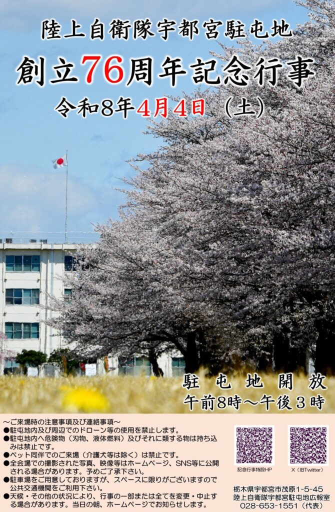 2026年4月4日(土)、陸上自衛隊 宇都宮駐屯地で「陸上自衛隊 宇都宮駐屯地 創立76周年記念行事」が開催!