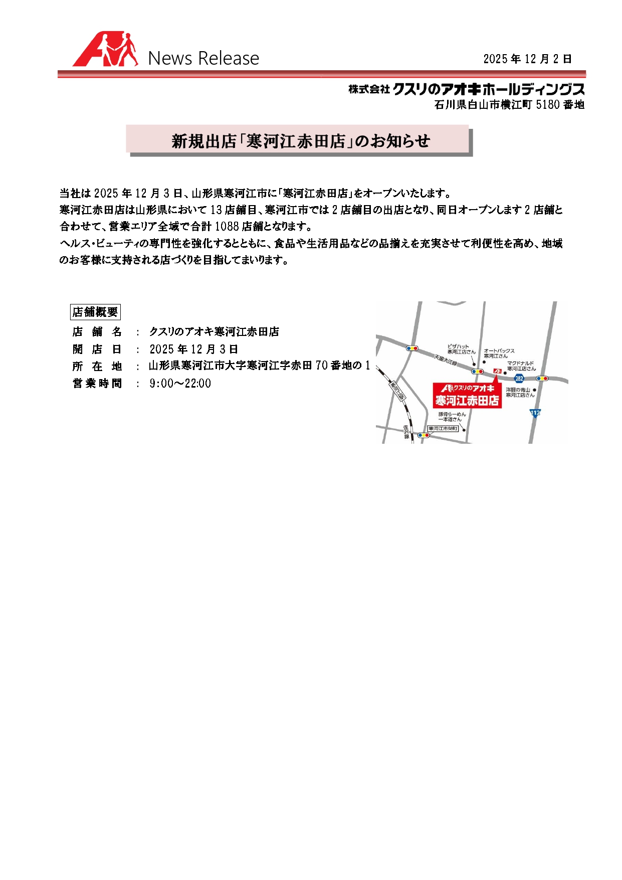 【開店】寒河江市寒河江赤田に「クスリのアオキ 寒河江赤田店」が12月3日ニューオープン!